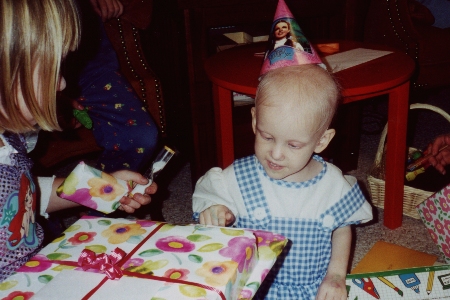 Hope turned three on October 7th, 2000. She had a Wizard of Oz themed party at our house with some close friends and 6-7 children. Hope was dressed as Dorothy. Unlike previous birthdays, Hope knew what birthday parties were all about this time. She blew out her candles and opened her presents like a pro.