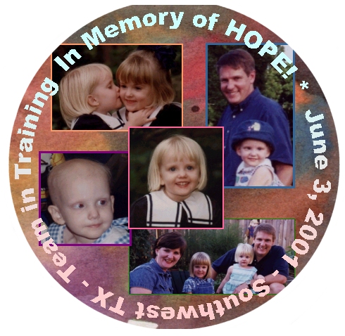Update 4/25/02: Two years since diagnosis -- it seems like it's been five (or more). Time has certainly deadened the pain, but the loss of feeling is both good and bad. The sharp edges of grief are gone, but so is the richness of the tremendous love that Hope provided. Sharolyn was asked to speak at the local American Cancer Society Relay for Life tomorrow night. We were going to collaborate on her speech, but once I read it, I knew there was no way I could improve on it. I've included it below. This speech reminded me of an article she wrote for the Candlelighters newsletter in the summer of 2000 about Hope's diagnosis. It too, is another example of her expressiveness that I cannot match and so much admire. It is also included below.